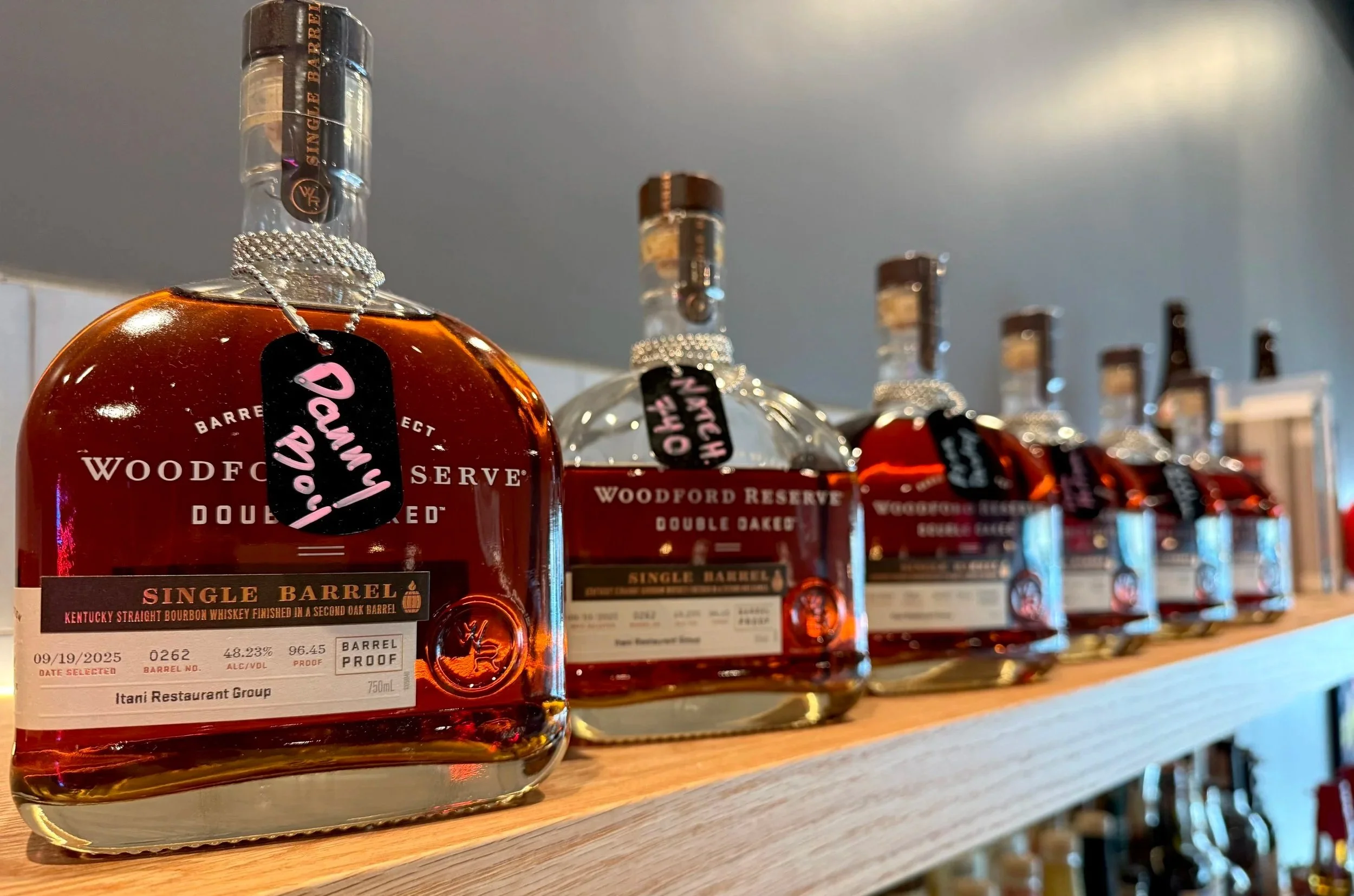 Our Woodford Double Oaked Bourbon is a single-barrel selection personally sourced by Chef Kyle and our team members, Hannah, Daniel, and Akia, on site in Kentucky. They chose it for its balance: pronounced caramel, toasted oak, and vanilla layered over a soft sweetness, with no excessive heat or bitterness. The flavors beautifully echo the umami and smoke in our food.